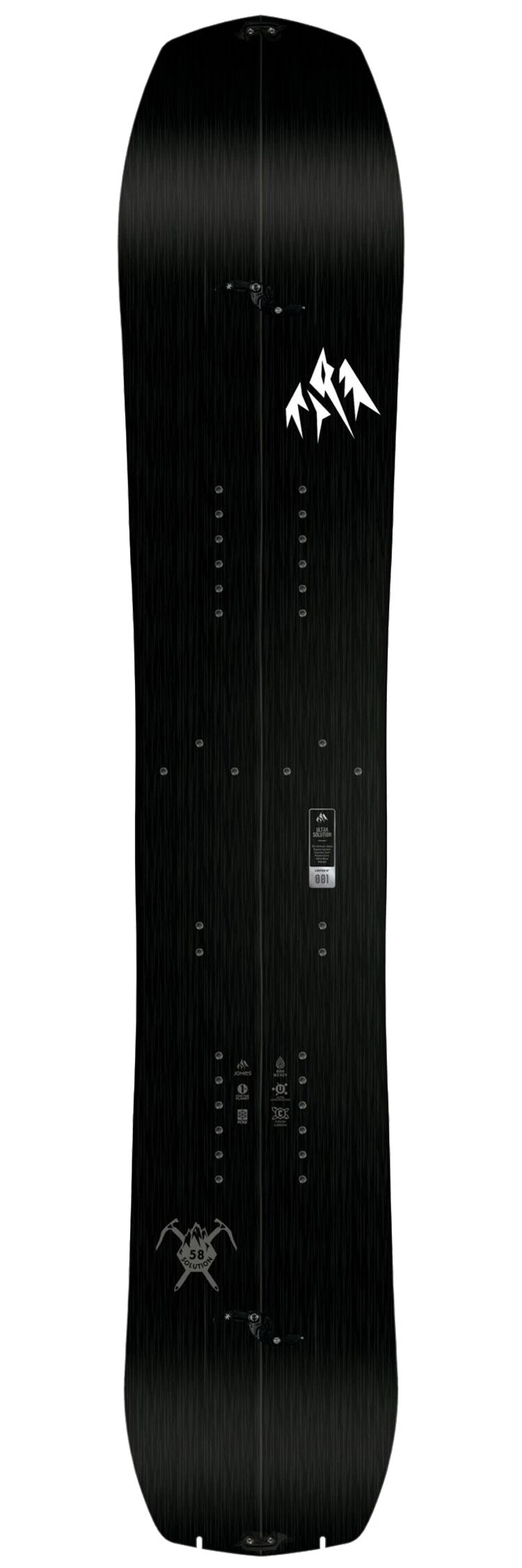 Avec l’Ultra Solution Jones propose un splitboard très performant doté d’un shape typé freeride et d’une construction haut de gamme offrant un maximum d’efficacité. La fabrication écoresponsable utilise un noyau bois renforcé de carbone, des carres et des chants recyclés, de la colle et du fart biosourcés. L’assemblage de la board se fait grâce à des clips Karakoram qui sont légers et fiables et assurent la bonne rigidité en torsion pour la descente.